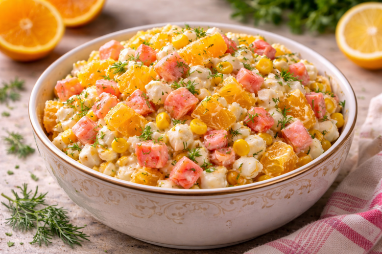Салат по-королевски с крабовыми палочками: всегда вызывает интерес за столом — нежный, простой и с неожиданной цитрусовой ноткой