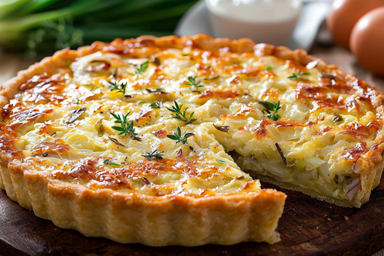 Для начинки берут 320 г белокочанной капусты, которую шинкуют и пассеруют с 1 средней луковицей до приобретения мягкости. В смазанную сливочным маслом форму сначала наливают часть теста, затем равномерно распределяют овощную смесь и покрывают оставшейся жидкой основой.
