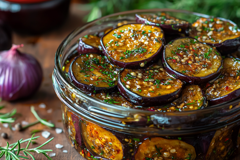 1 кг молодых баклажанов нарежьте кружочками толщиной 1,5 см, пересыпьте 2 ч. л. соли и оставьте на 30 минут. Промокните выделившийся сок и обжарьте на оливковом масле до мягкости. В сотейнике смешайте 150 мл меда, 5 ст. л. уксуса, 400 мл оливкового масла, 1 ст. л. кориандра, 1 ст. л. фенхеля, 1 ст. л. горчичных зерен, 4 перчика чили, 4 гвоздички, 4 лавровых листа, 2 ч. л. соли и 4–5 измельченных зубчиков чеснока. Доведите до кипения, добавьте 1 нарезанную красную луковицу и баклажаны. Томите 15 минут на слабом огне. Разложите по стерильным банкам вместе с маринадом, закатайте и храните в прохладном месте.